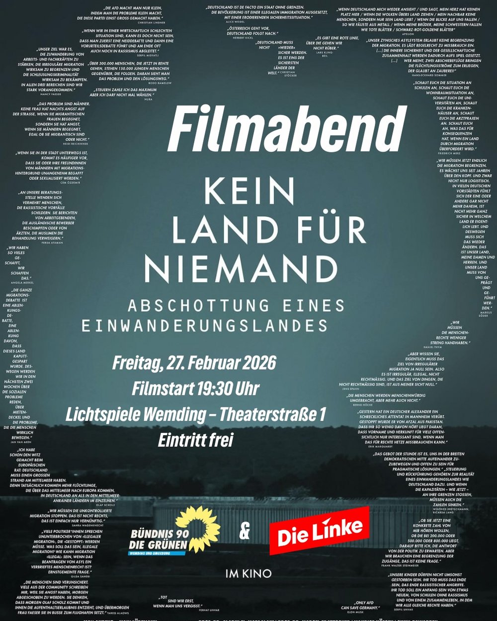 Am Freitag, 27. Februar, lädt die Stadtratsliste GRÜNE/Die Linke alle Interessierten herzlich zum Kinoabend in die Lichtspiele Wemding ein. Gezeigt wird die Dokumentation „Kein Land für Niemand“, welche unter anderem die humanitäre Krise an Europas Grenzen beleuchtet. Filmbeginn ist 19:30 Uhr. Der Eintritt ist frei. Im Anschluss an die Vorstellung gibt es eine Gesprächsrunde mit einer Vertreterin von SOS Humanity.
