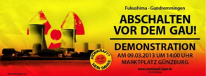 Am Samstag, 9. März 2013, demonstrieren Bürgerinnen und Bürger bundesweit gegen den gefährlichen Atomwahn und fordern den sofortigen Atomausstieg. Wir fahren gemeinsam mit dem Zug. Treffpunkt: 11.30 Uhr am Bahnhof Donauwörth.