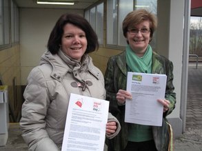 Die beiden Grünen verteilten Anstecker "Die Rote Tasche", das Symbol für die um 23 Prozent leereren Taschen der Frauen, und Informationsflyer.