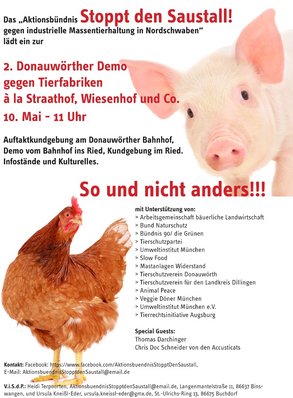Das Aktionsbündnis "Stoppt den Saustall" läd am Samstag, den 10.5.2014, ab 11:00 Uhr zur 2. Demo gegen industrielle Massentierhaltung in Nordschwaben nach Donauwörth ein.