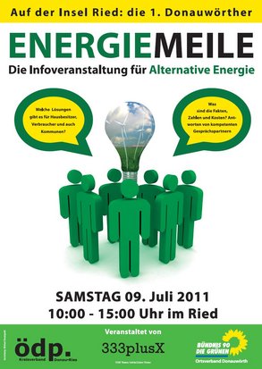 An 11 Info-Ständen wird ein weiter Themenbogen gespannt: Naturstrom, Biogas-Anlagen, Windkraft im Landkreis, Zukunftsinvestitionen, grüne Computer, E-Mobilität, das FORUM, Kinder gegen Atomkraft, Bund Naturschutz, VG Ascha, Pelletswerk Ziertheim, Bürgerwindpark Auernheim, Bürgergenossenschaft Energiewende, Projekt 21plus, ÖDP, Die Grünen, Projekt 333plusX (mit Infos zum Grünen Stromlabel, EWS-Schönau, Greenpeace Energy, Easywin 6 und der Hochtemperatur-Brennstoffzelle).