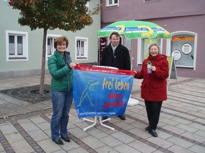 Der Kreisverband von Bündnis 90/Die Grünen beteiligte sich anlässlich des "Internationalen Tags gegen Gewalt an Frauen" an der bundesweiten Fahnenaktion. Rund um den 25.November, dem internationalen Gedenktag NEIN zu Gewalt an Frauen, setzten die Teilnehmerinnen mit der Fahne Frei leben ohne Gewalt ein weithin sichtbares Zeichen gegen tägliche Gewalt an Mädchen und Frauen. Kreisvorsitzende Ursula Kneißl-Eder, Kreisvorsitzender Albert Riedelsheimer und Kreisrätin Marianne Ach informierten an einem Informationsstand im Donauwörther Ried. Am Stand lag eine Unterschriftenliste für ein Aufenthaltsrecht für die Opfer von Zwangsprostitution auf.