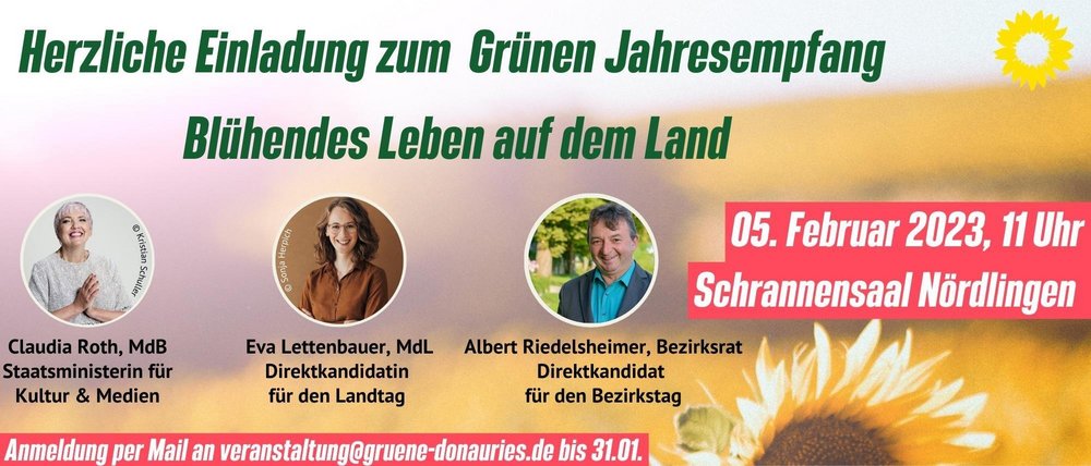 Der Donau-Rieser Grünen Kreisverband lädt alle Donau-Rieser Bürger*innen zum Jahresempfang unter dem Motto „blühendes Leben auf dem Land“ ein. Kreissprecher Stefan Bieber: „Wir freuen uns sehr darüber, dass Kulturstaatsministerin Claudia Roth, Landtagsabgeordnete Eva Lettenbauer und Bezirksrat Albert Riedelsheimer als Redner*innen an unserem Empfang teilnehmen werden. Denn egal ob in Berlin, München oder hier im Donau- Ries: Wir Grüne haben die Menschen auf dem Land im Blick und kümmern uns um ihre Anliegen.“