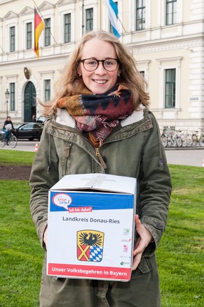 Gemeinsam mit vielen anderen Gegnerinnen und Gegner des Freihandelsabkommens der EU mit Kanada (CETA) wurden am vergangenen Freitag die Unterschriften aus dem Landkreis Donau-Ries für das Volksbegehren "Nein zu CETA!" beim bayerischen Innenministerium eingereicht. Eva Lettenbauer aus Reichertswies übergab die vom Aktionsbündnis Donau-Ries - Stop CETA gesammelten Unterschriften und erklärt: "Wir werden im Landkreis auch zur Teilnahme am Volksentscheid und zur Eintragung in den Rathäusern mobilisieren, wenn es so weit ist. Alle können mitmachen und so niedrige Umweltstandards und Sonderrechte für Konzerne verhindern!" Das Bündnis im Landkreis besteht aus Bündnis 90/ Die Grünen Kreisverband Donau-Ries, der Bund Naturschutz Kreisgruppe Donau-Ries, der Katholischen Arbeitnehmer-Bewegung Kreisverband Dinkelsbühl/ Donau-Ries und der Ökologisch-Demokratischen Partei Kreisverband Donau-Ries/ Dillingen. Insgesamt wurden in Bayern 85.146 gültige Unterschriften gesammelt. Schon 25.000 Unterschriften hätten ausgereicht. Ziel des Volksbegehrens ist es die Bayerische Staatsregierung per Volksentscheid zur Ablehnung des Freihandelsabkommens CETA im Bundesrat zu verpflichten.